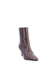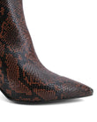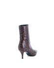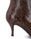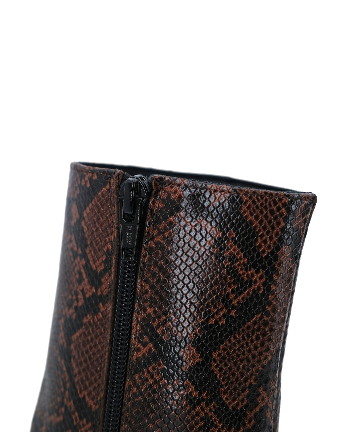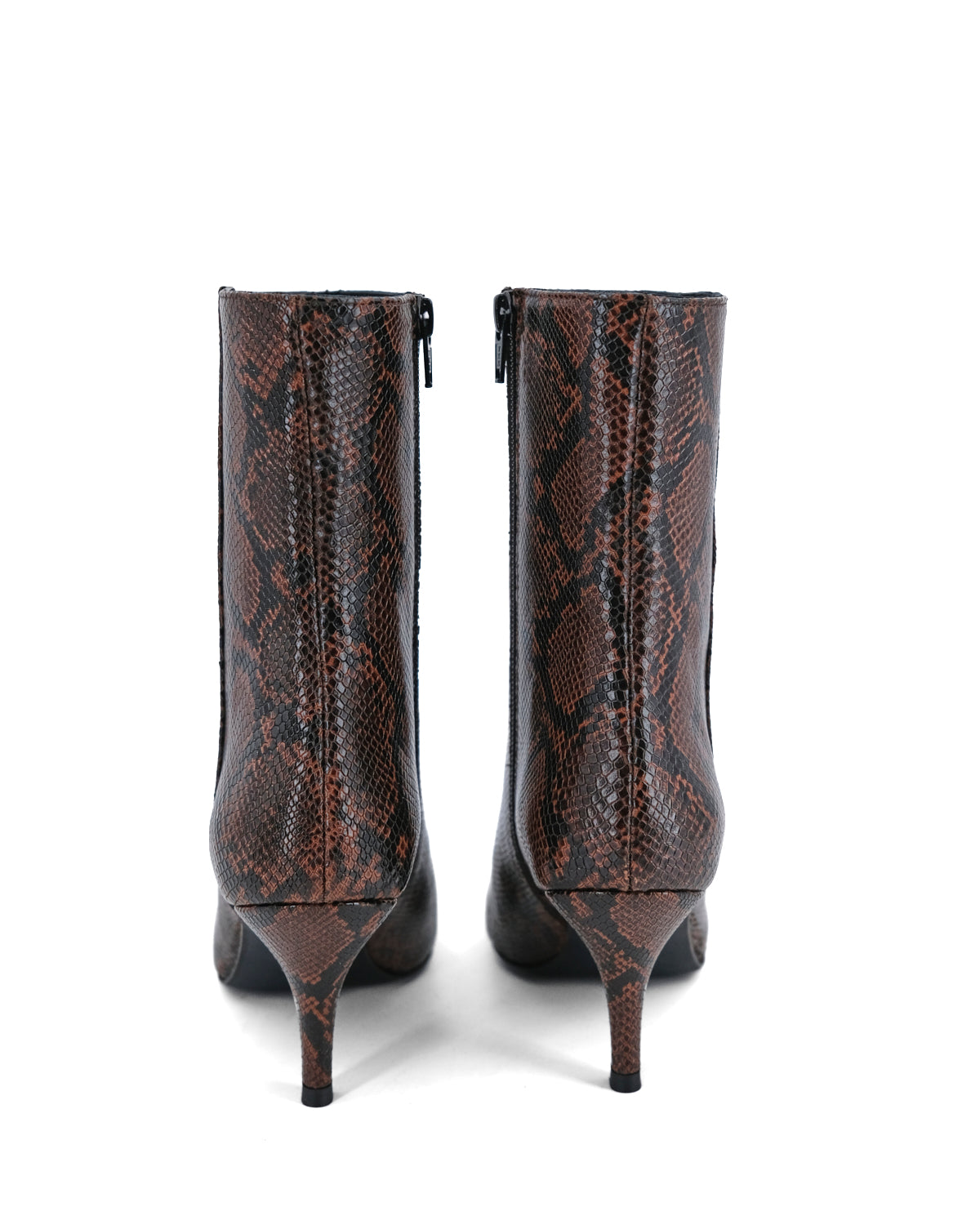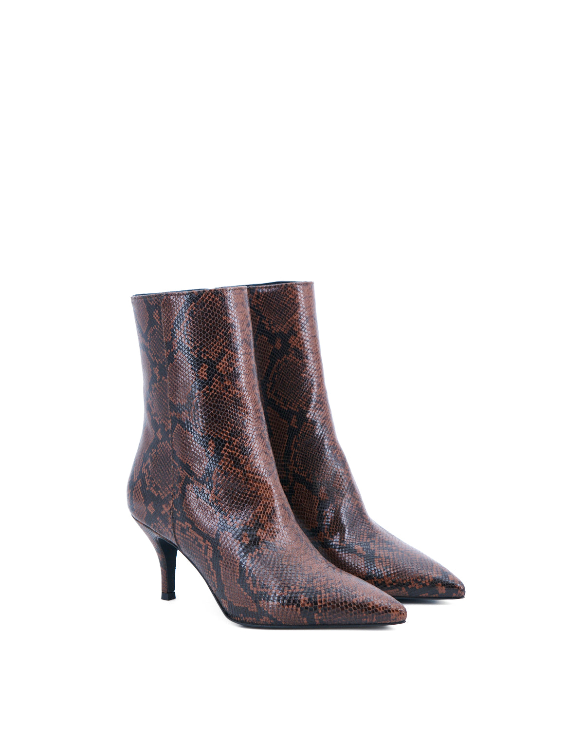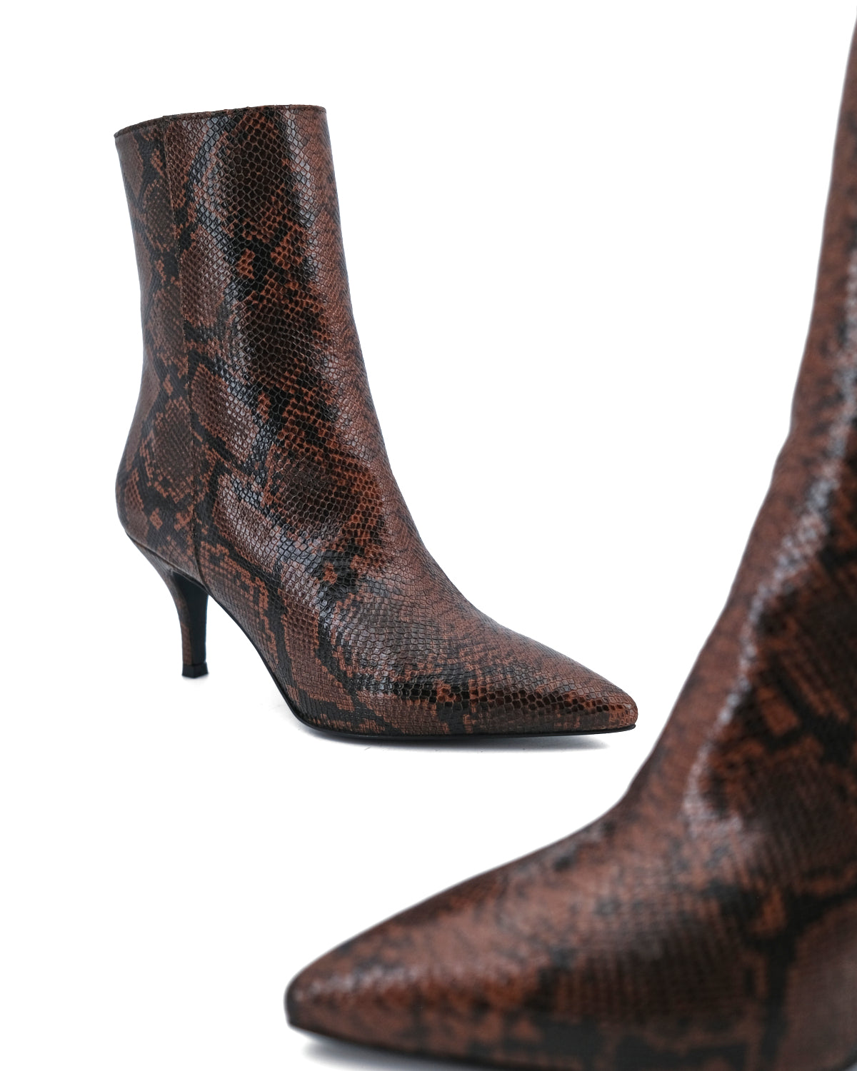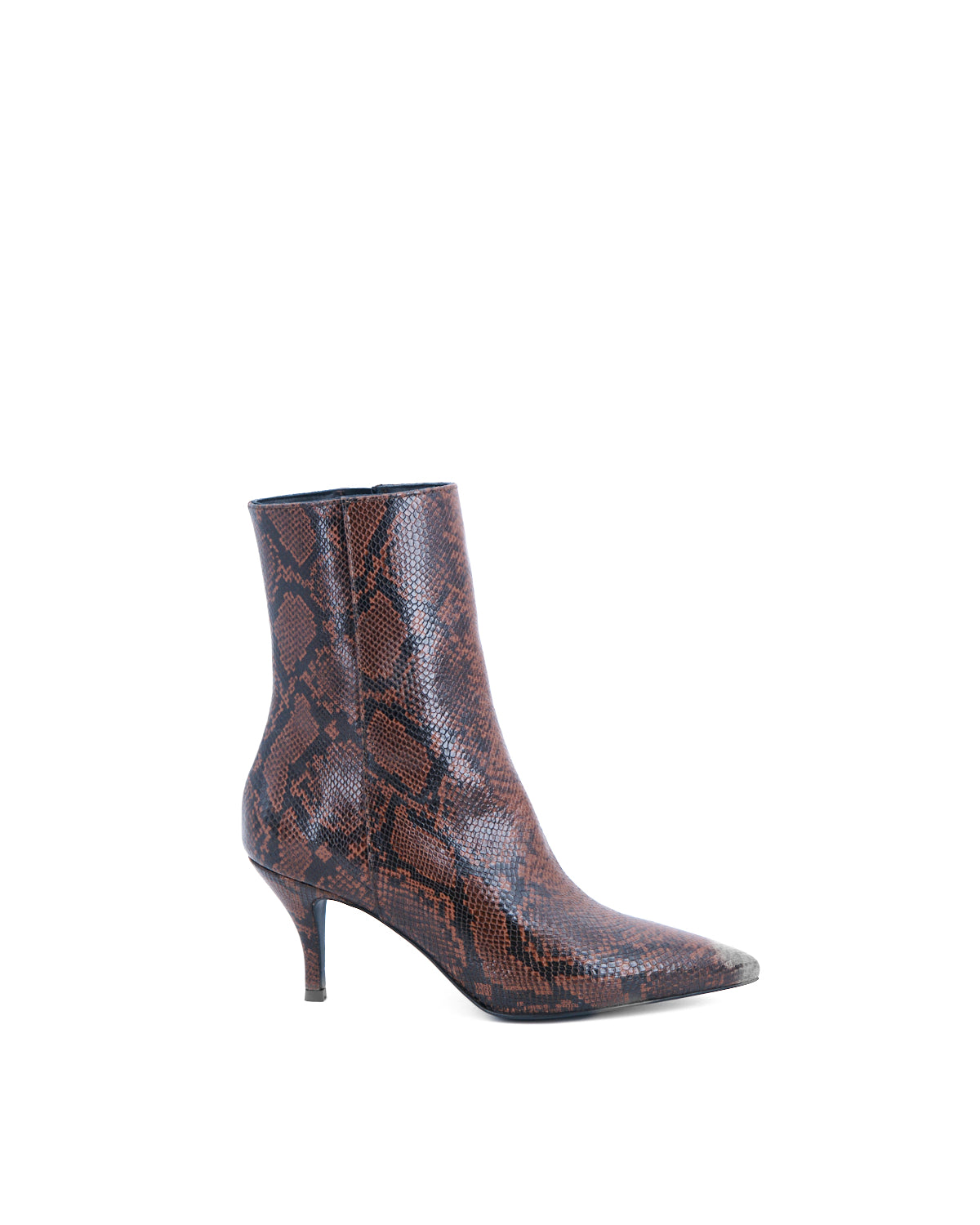 Linee femminili e sofisticate per questo stivaletto con zip laterale e tacco dalle linee geometriche impreziosito dal pellame stampato pitone che da un tocco glamour ad ogni look.