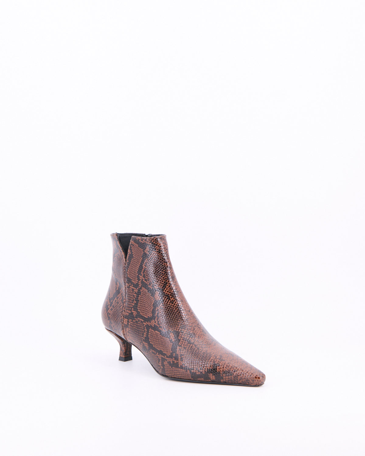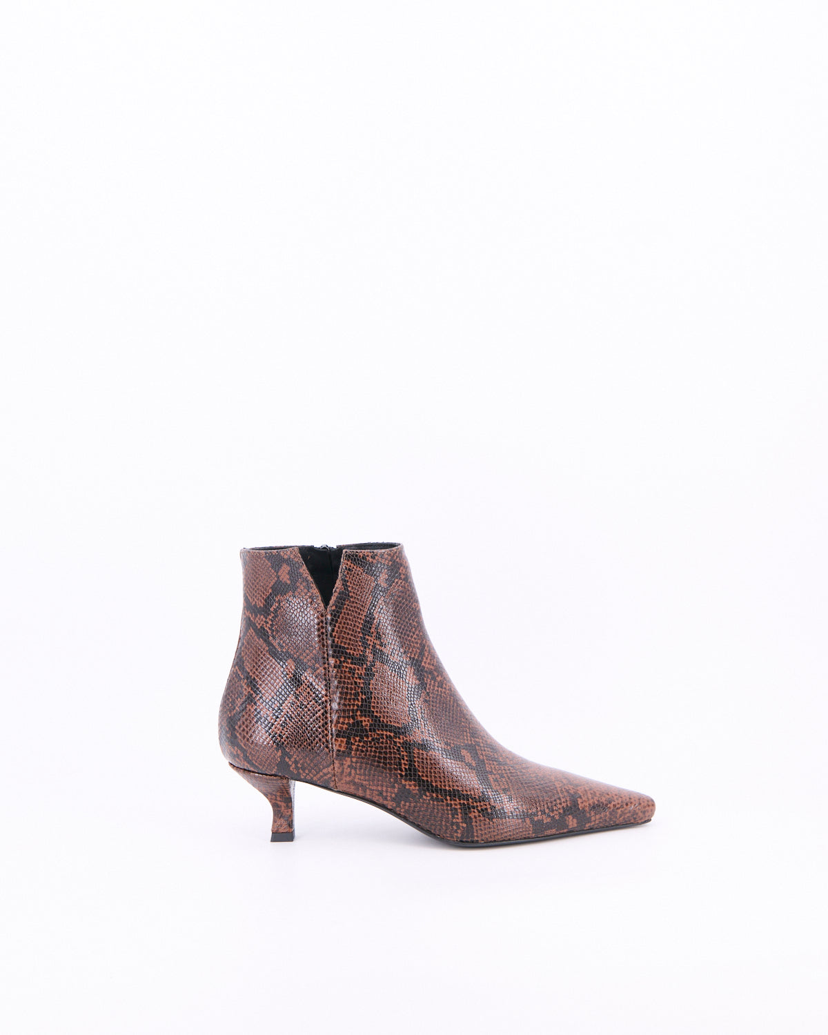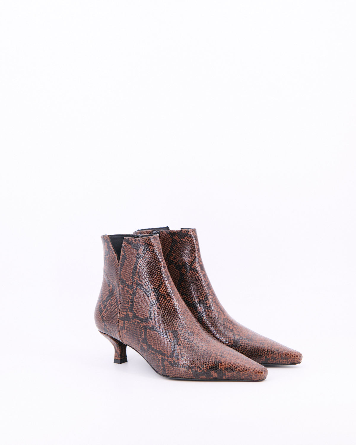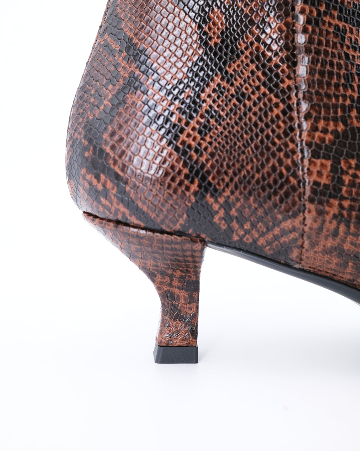 Di ispirazione retrò e dalle linee femminili per questo stivaletto impreziosito da un piccolo spacco laterale che dona slancio alla silhouette ideato per dare un tocco di stile ad ogni look. Altezza tacco : 5,5 cm Composizione : Pelle stampata pitone Calzata:Regolare Fatto a mano in Italia |