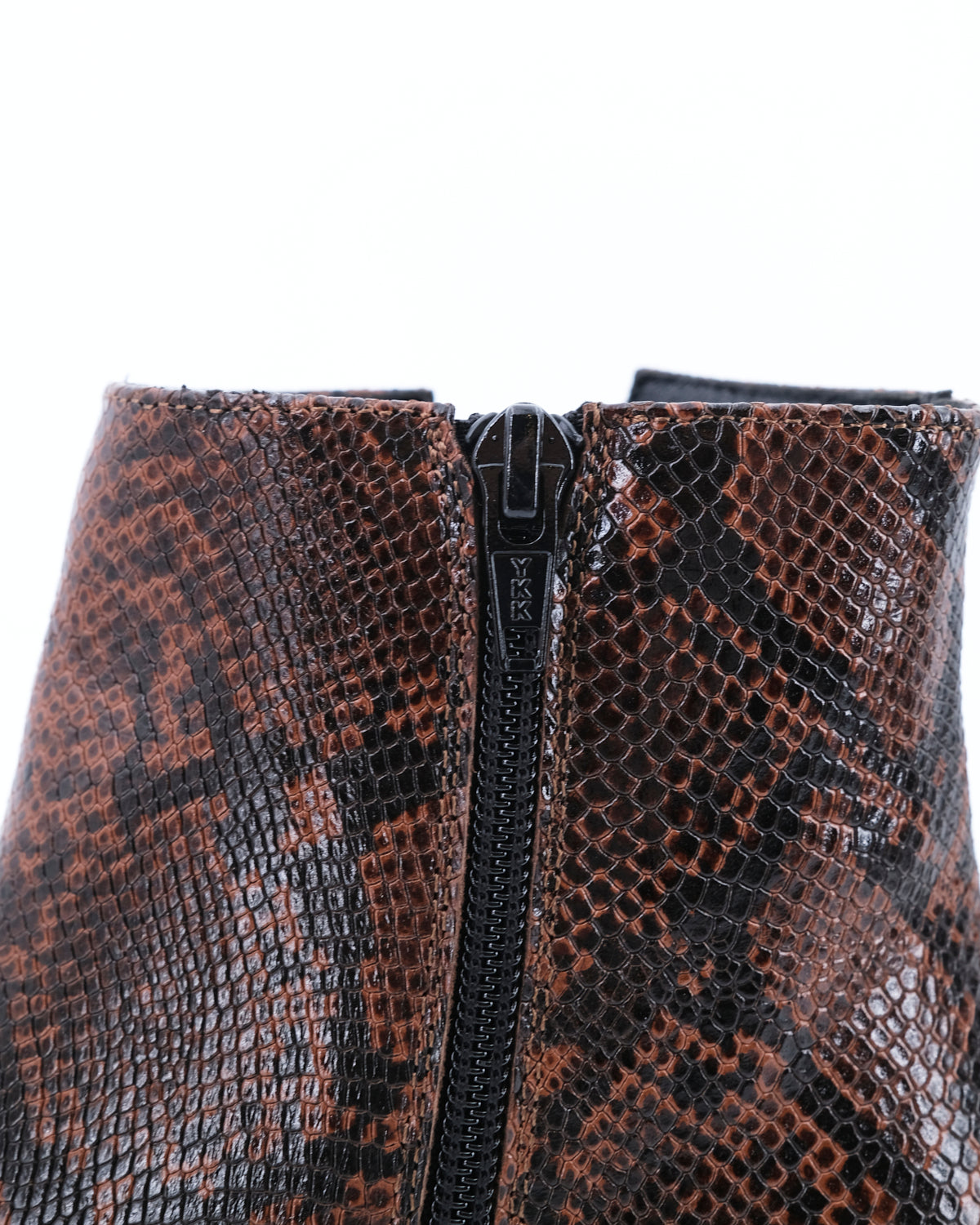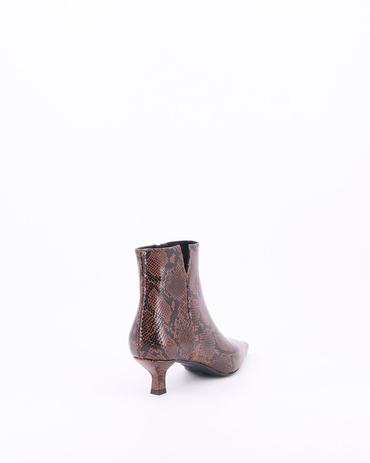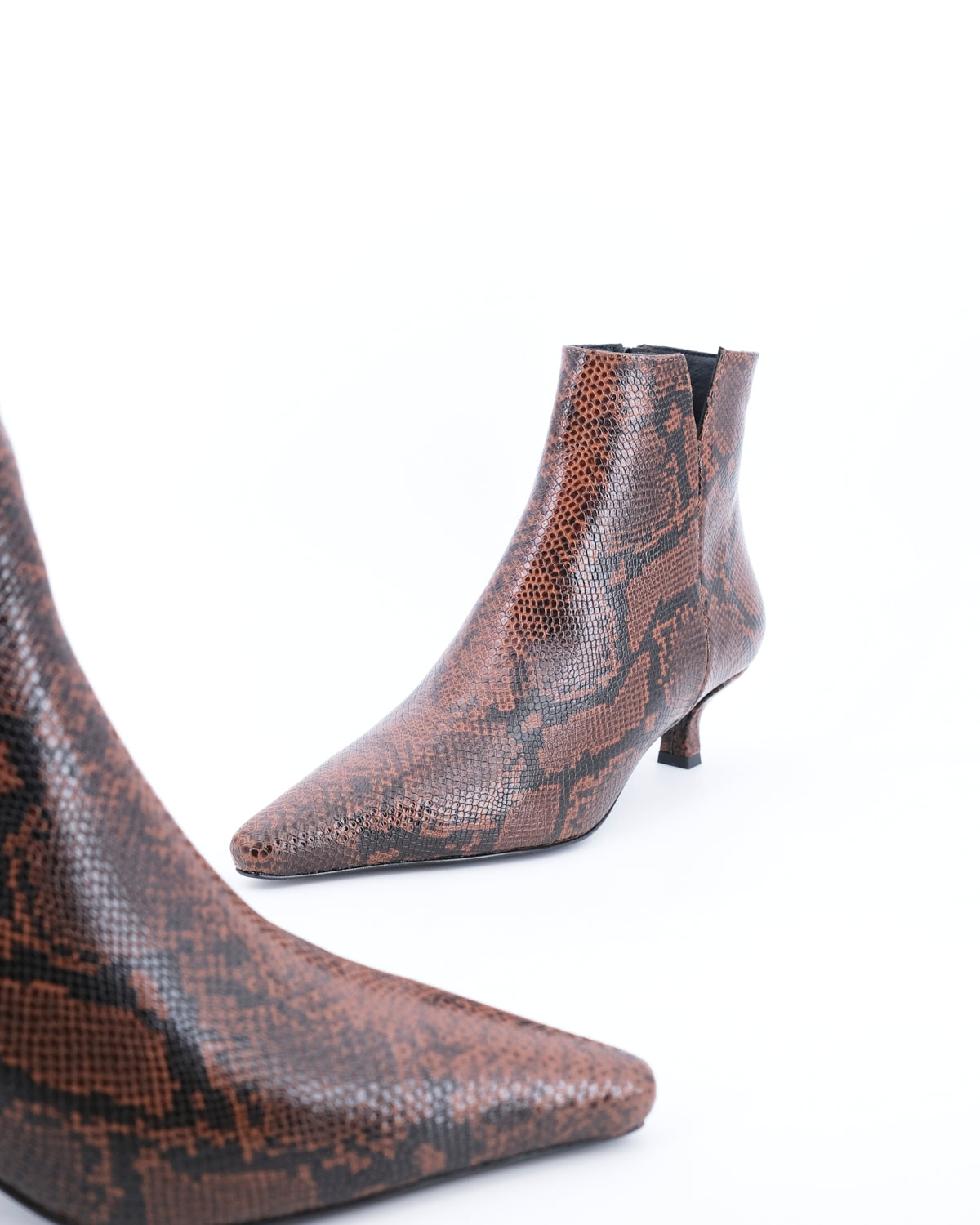 Di ispirazione retrò e dalle linee femminili per questo stivaletto impreziosito da un piccolo spacco laterale che dona slancio alla silhouette ideato per dare un tocco di stile ad ogni look. Altezza tacco : 5,5 cm Composizione : Pelle stampata pitone Calzata:Regolare Fatto a mano in Italia |