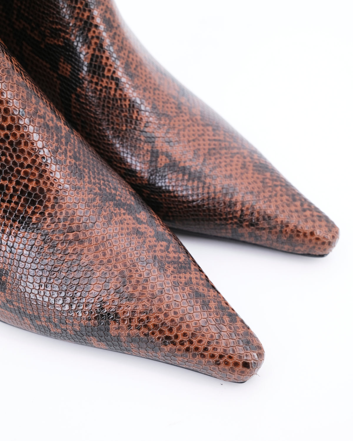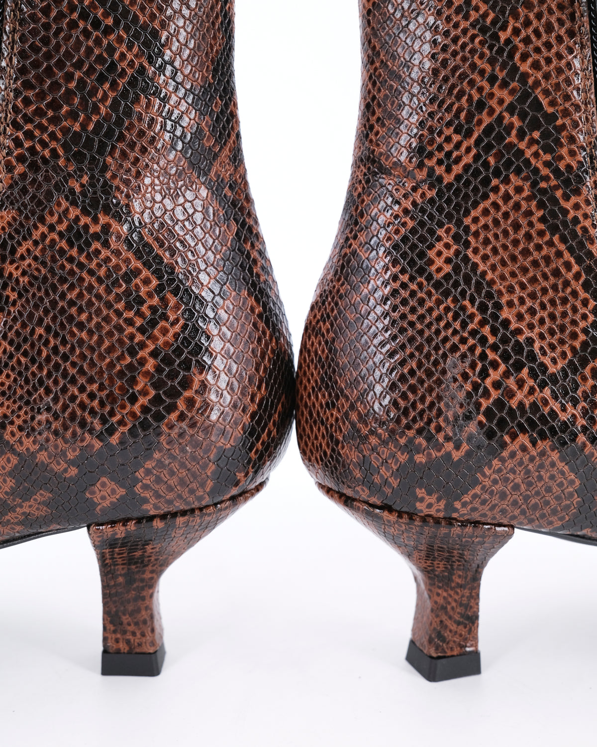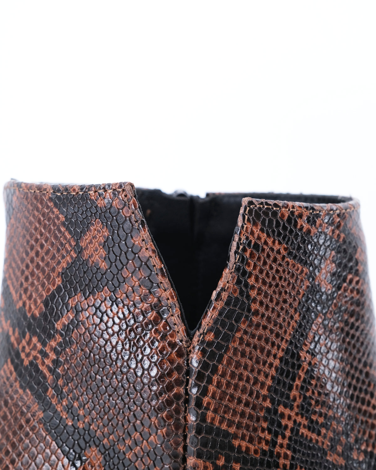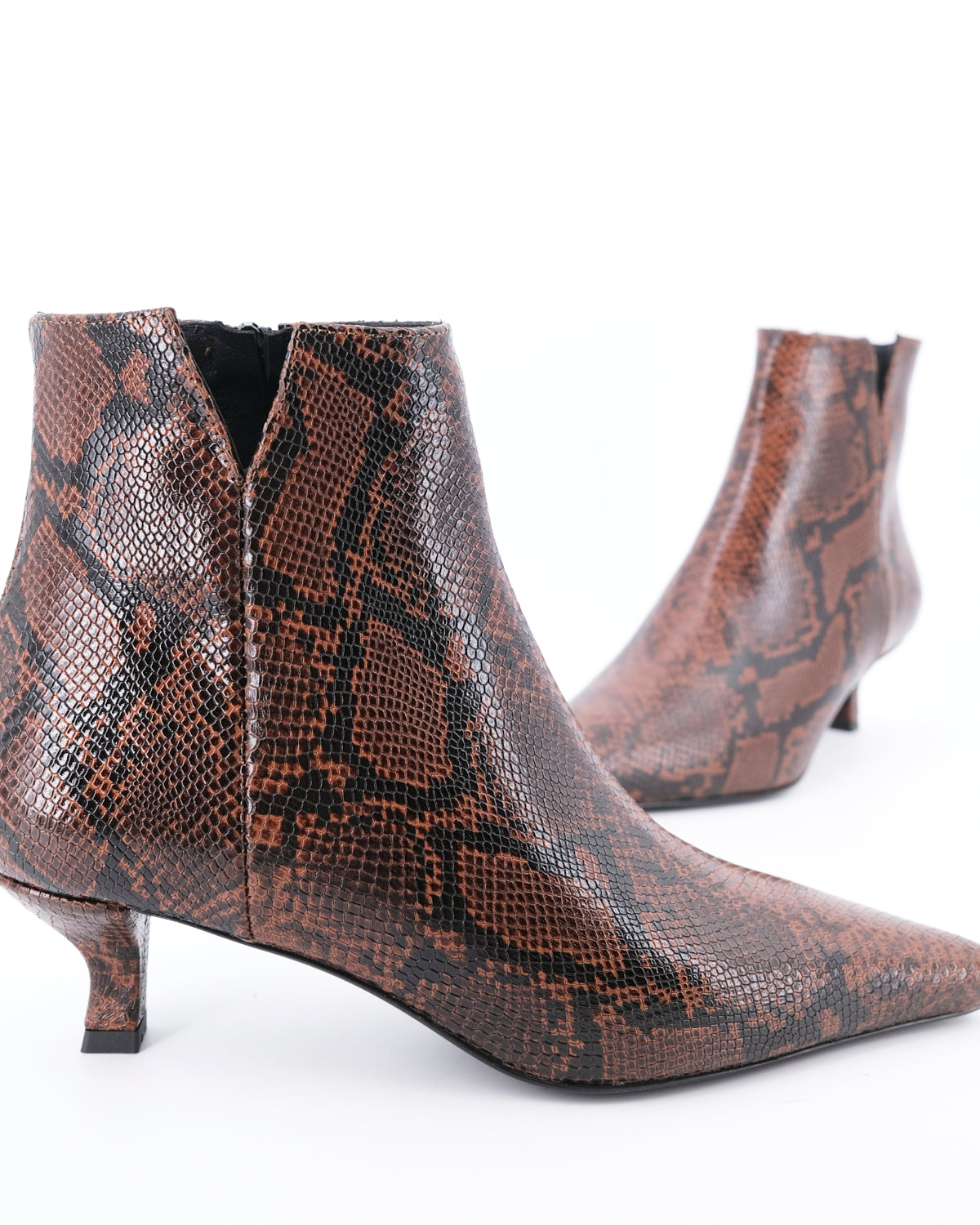 Di ispirazione retrò e dalle linee femminili per questo stivaletto impreziosito da un piccolo spacco laterale che dona slancio alla silhouette ideato per dare un tocco di stile ad ogni look. Altezza tacco : 5,5 cm Composizione : Pelle stampata pitone Calzata:Regolare Fatto a mano in Italia |