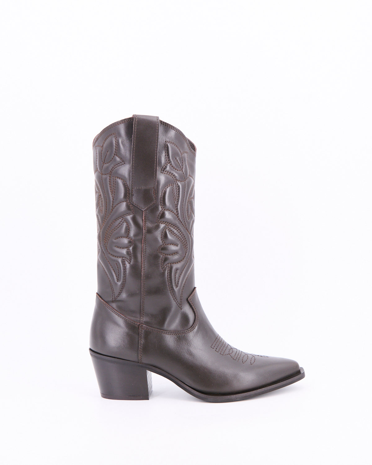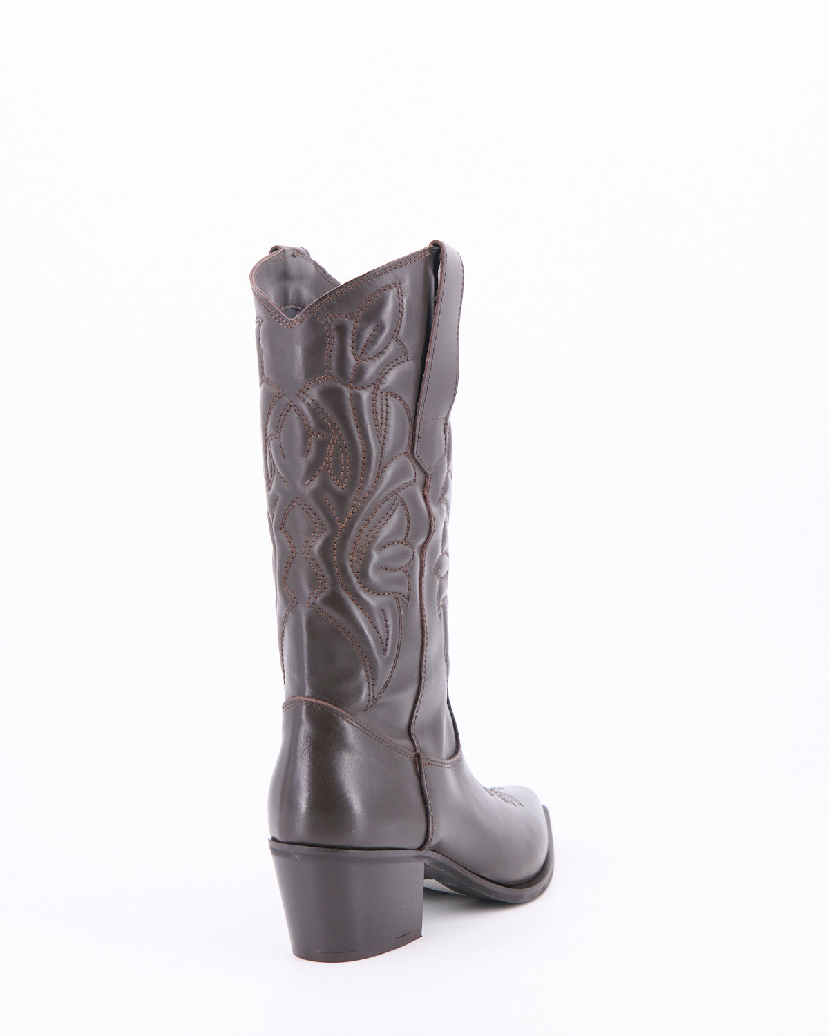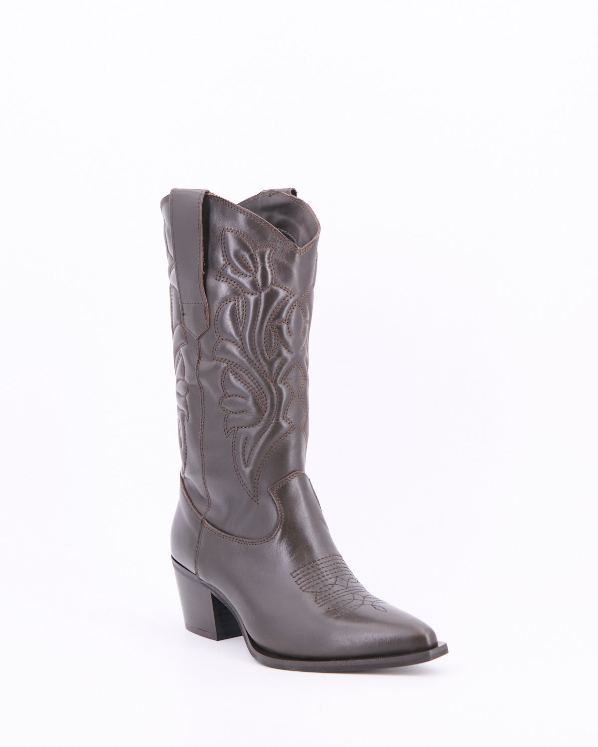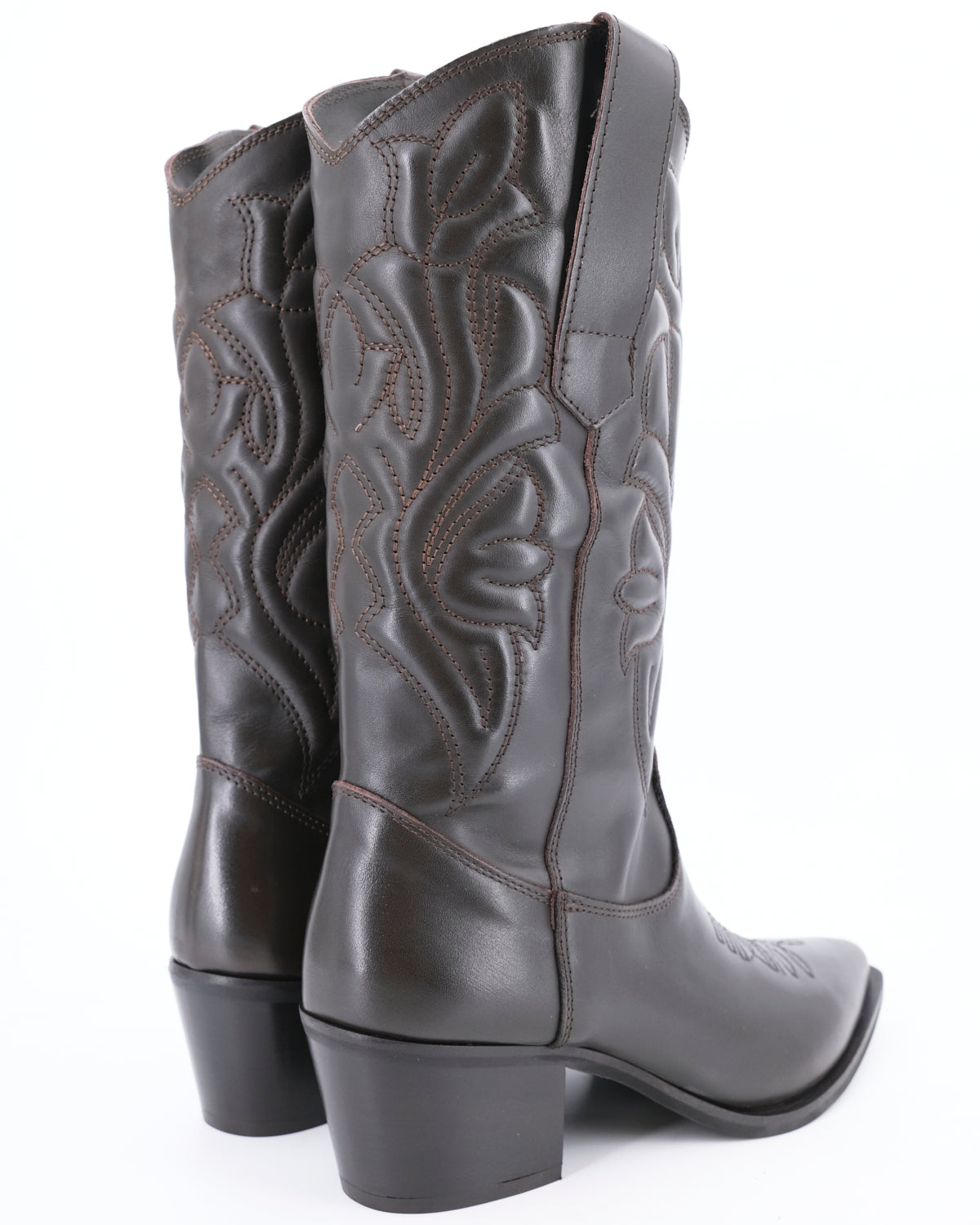 Stivale stile texano a punta realizzato in pelle impreziosito da ricami imbottiti di ispirazione Western per look glamour e casual.