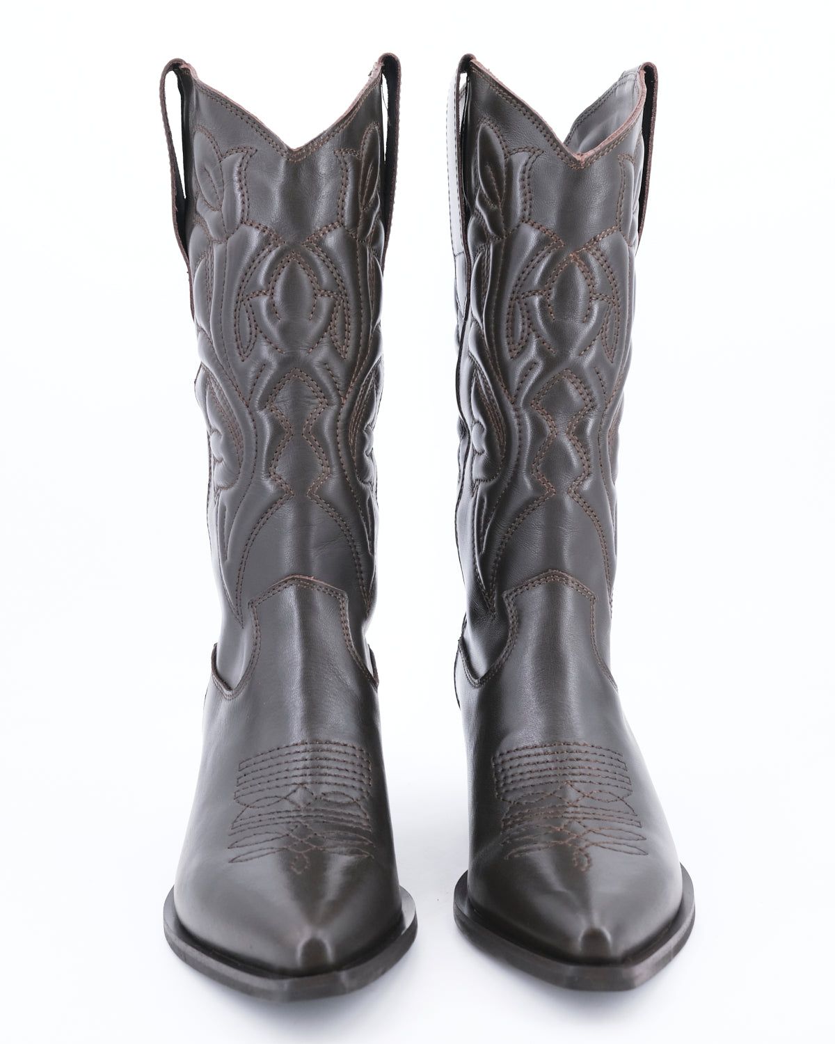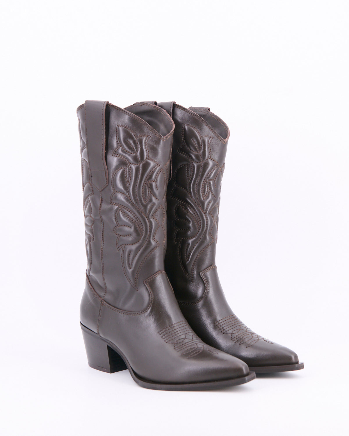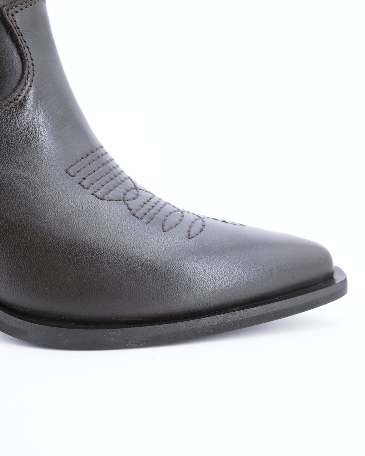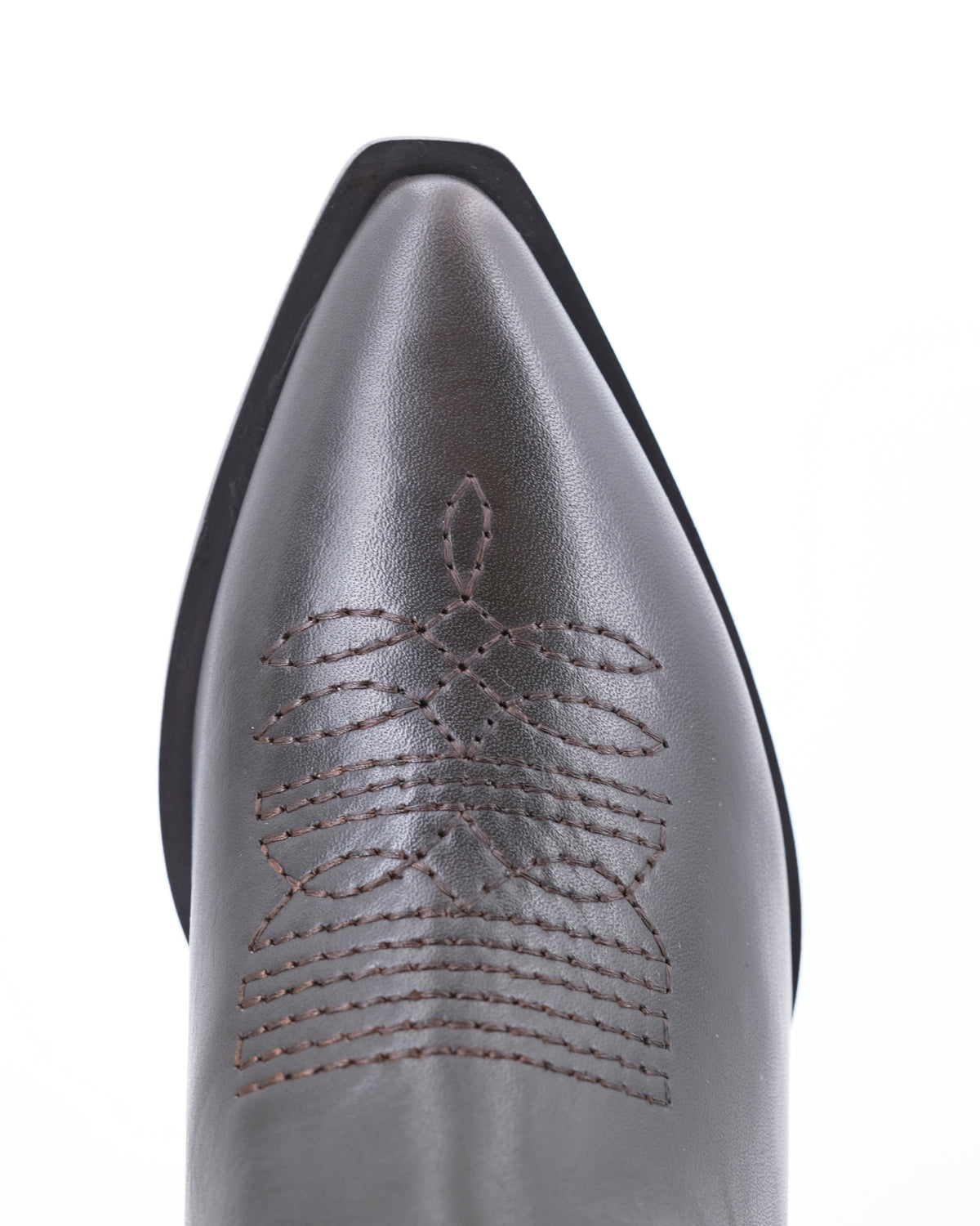 Stivale stile texano a punta realizzato in pelle impreziosito da ricami imbottiti di ispirazione Western per look glamour e casual.